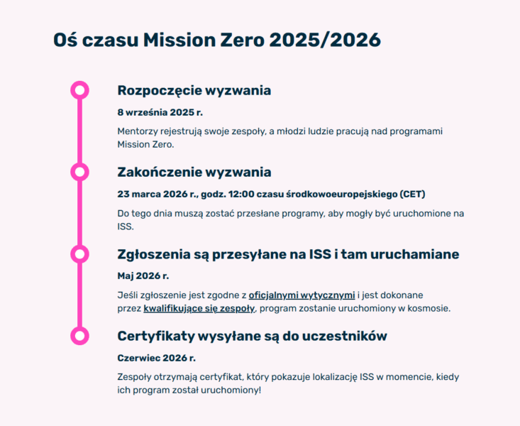 - Program każdego uczestnika lub zespołu, którego zgłoszenie spełnia kryteria kwalifikacyjne i jest zgodne z oficjalnymi wytycznymi dotyczącymi udziału w Misji Zero, zostanie uruchomiony w kosmosie!